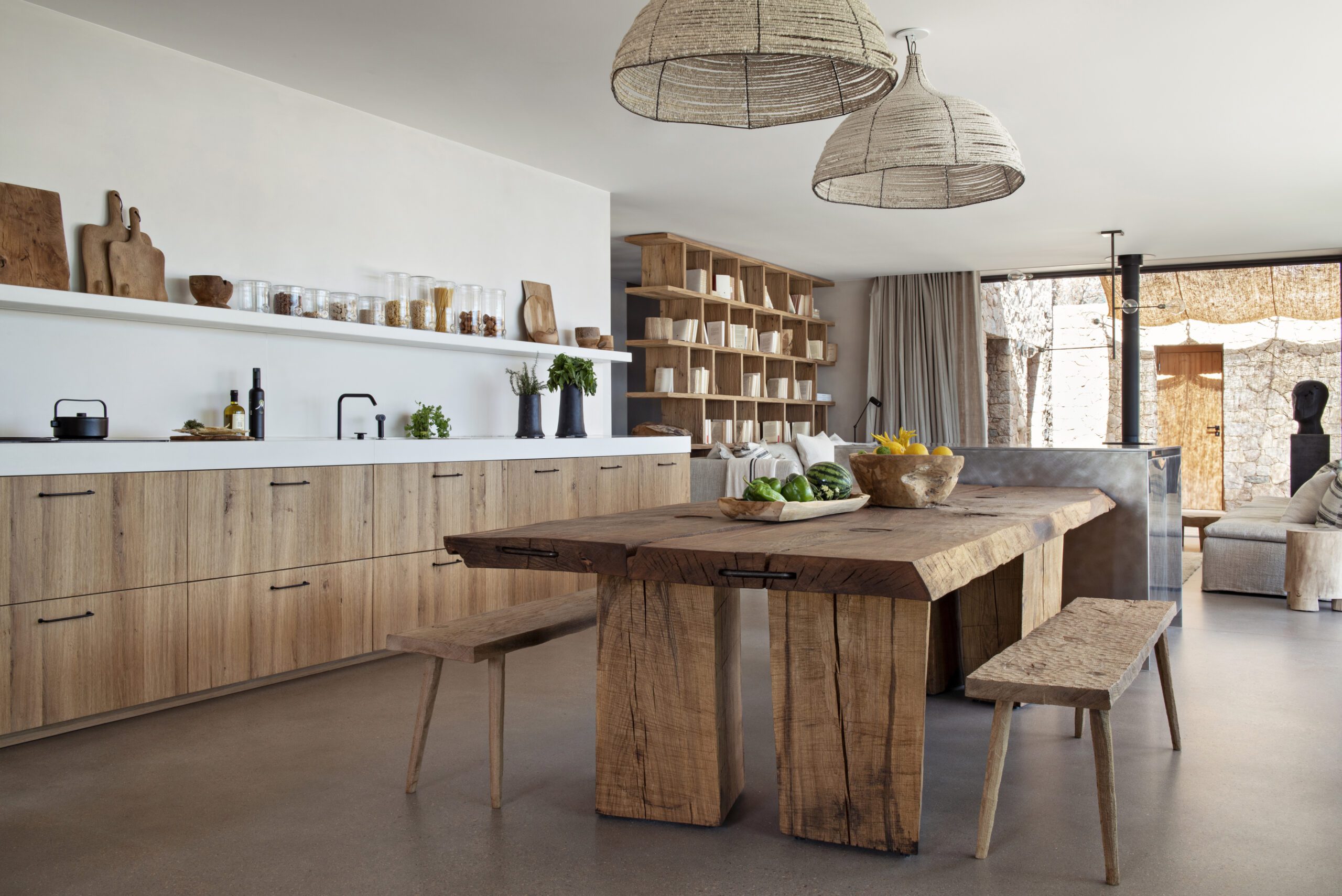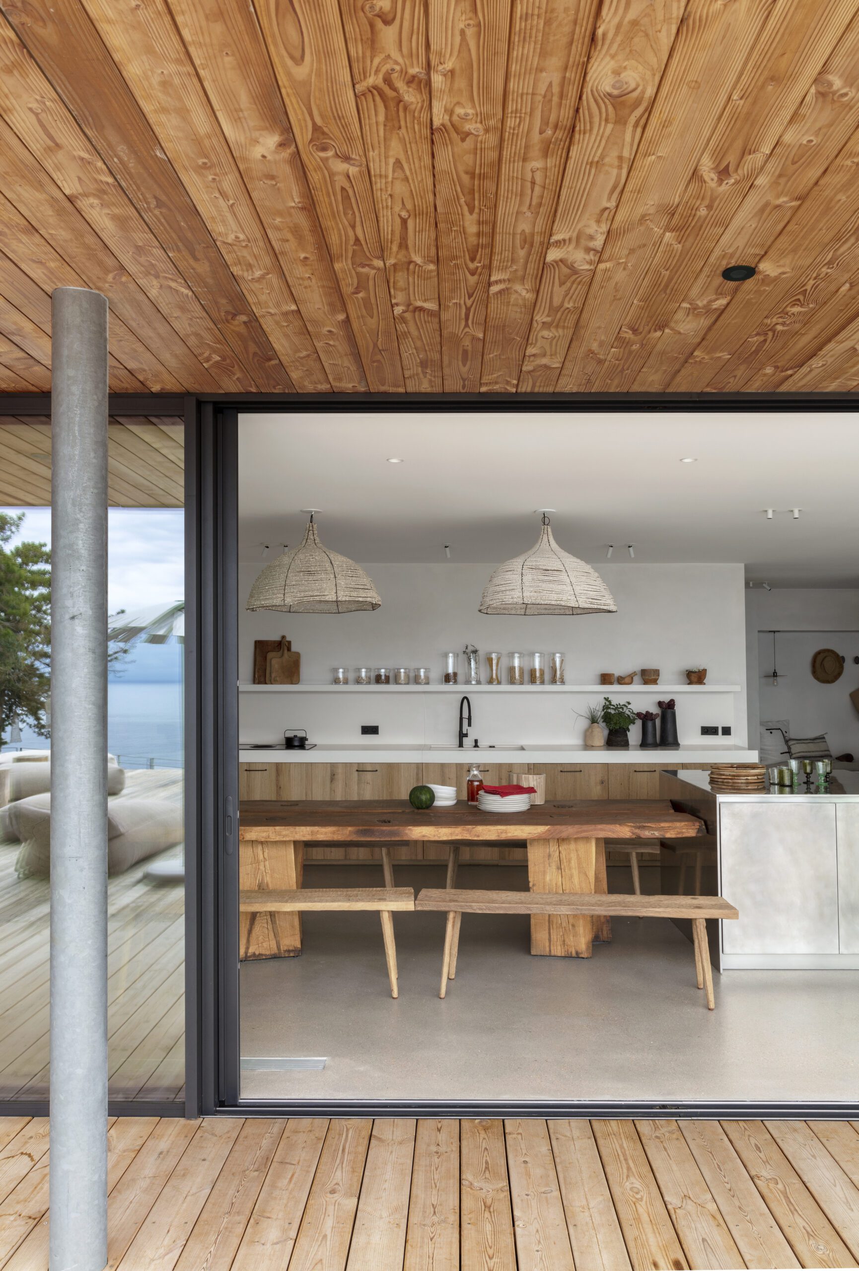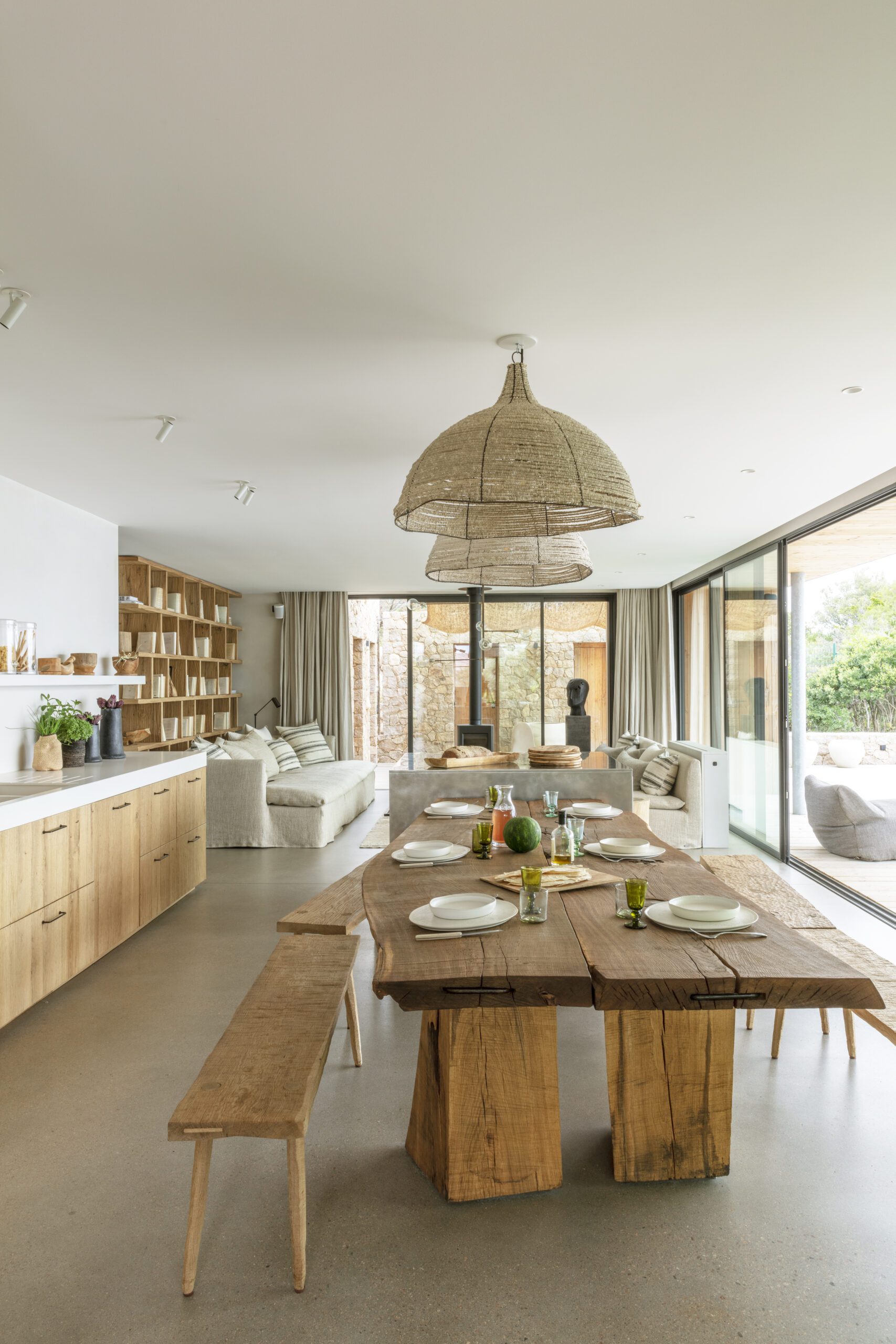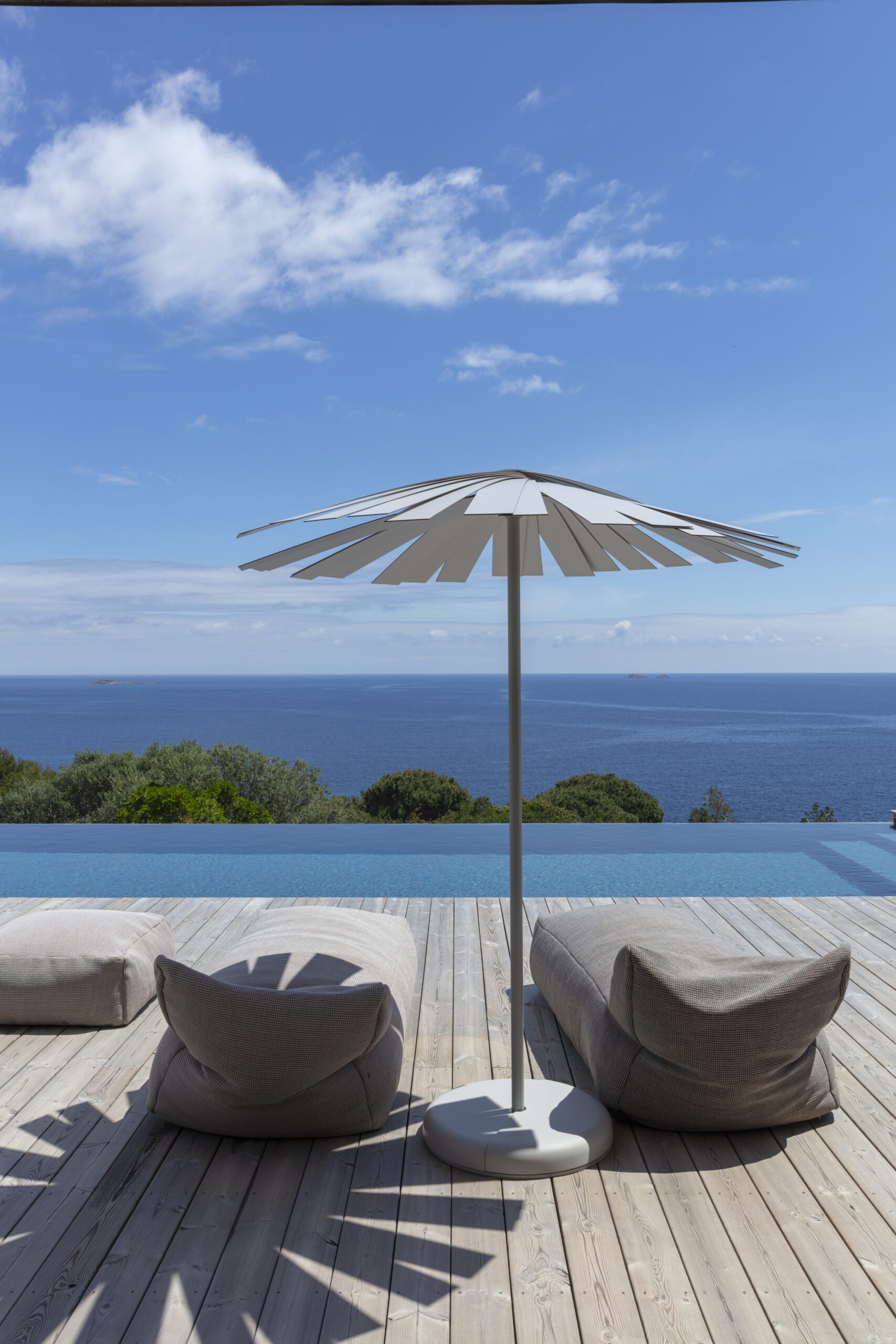Les vastes espaces de vie s’ouvrent sur l’extérieur : un salon lumineux, une cuisine élégante et une table conviviale pour 12 convives. À l’horizon, la piscine à débordement se fond dans le bleu de la mer, entourée de terrasses, d’un solarium et d’espaces lounge propices à la détente.